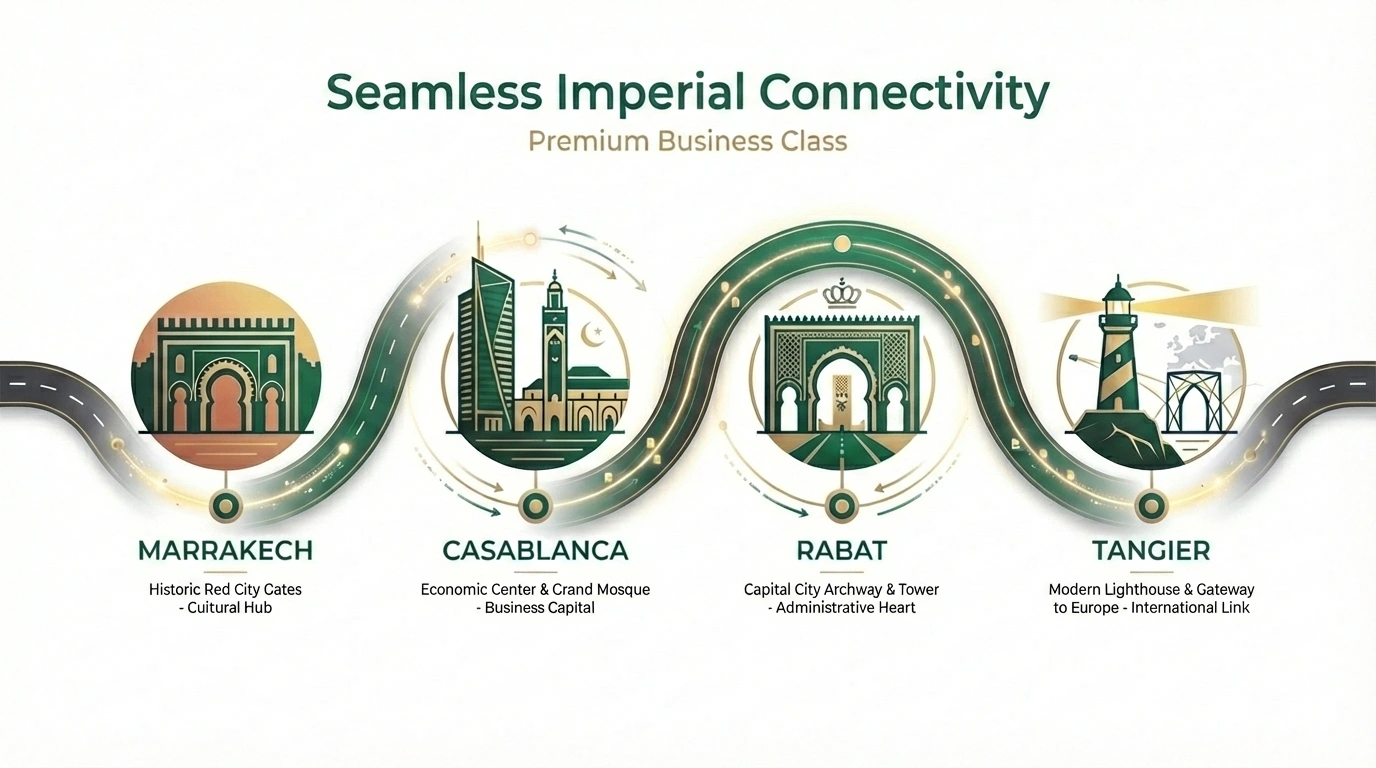 Journeying between Morocco’s imperial capitals—Marrakech, Casablanca, Rabat, and Tangier—is more than transportation; it is a passage through culture, commerce, and history. For the discerning traveller, however, crowded terminals and rigid schedules diminish the experience. Aman Journey transforms inter‑city travel into a private, refined progression—where the journey itself becomes an extension of your lifestyle.